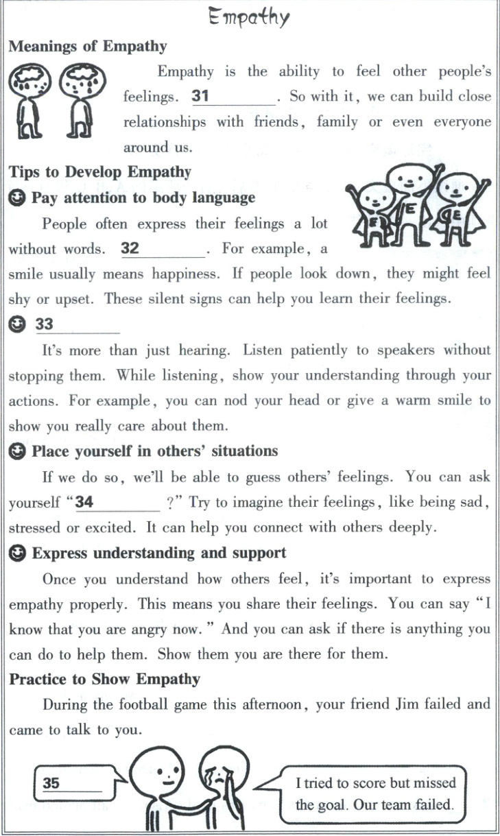 31—34 CBAE 35. I know you may feel disappointed. I’m always here for you. (或I know you tried your best. You can do better next game. 或Don’t give up! Let’s practice more for the next game.)