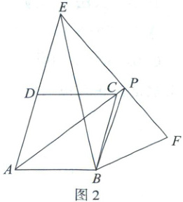 (2)如图2,$E$是$AD$延长线上的一点,连接$BE$,作$\triangle FBE$与$\triangle ABE$关于直线$BE$对称,$EF$交射线$AC$于点$P$,连接$BP$.