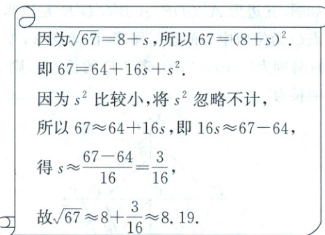 (1)因为$\sqrt{67}$=9−t,所以67=(9−t)²,即67=81−18t+t².因为t²比较小,将t²忽略不计,所以67≈81−18t,即18t≈81−67.得t≈$\frac{81−67}{18}$=$\frac{7}{9}$,故$\sqrt{67}$≈9−$\frac{7}{9}$≈8.22. (5分)