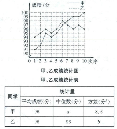 乙的成绩为$94$,$95$,$96$,$95$,$96$,$98$,$97$,$96$,$97$,$96$,
