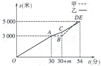 (2)根据题意,得$3000 + 100×(1 - 50\%)m + 100(54 - 30 - m) = 5000$(难点:要求出直线$CE$的解析式,必须求得$C$点坐标,首先求出坐标系中$m$的值,从“乙行驶的总路程=各段路程之和”列出关于$m$的方程便可突破这个难关),