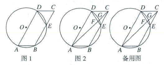 24. (本小题满分12分)如图1,在$□ ABCD$中,$\angle DAB=60^{\circ}$,过$A$,$B$,$D$三点的$\odot O$交$BC$于点$E$,连接$DE$.