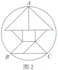 4. 传统的七巧板是从我国宋代的“燕几图”演变而来的,能拼出 1600 多种不同的图形。嘉琪同学用边长为 $ 4\sqrt{2} $ 的正方形纸板做出如图 1 所示的七巧板,拼接成小鱼图案(外轮廓是轴对称图形)并把图案放到圆中,如图 2 所示,A,B,C 三点在圆上。圆的半径是__________。