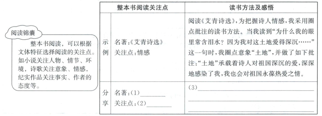 (3)阅读《红星照耀中国》,我关注作品所写的事实。我采用浏览目录和跳读正文的方法,厘清了历史事件的前因后果和发展线索,了解了共产党和红军绝处求生的经过,以及共产党领袖人物的成长历程。这些让我懂得:中国共产党拥有强大的生命力和光明的前途。