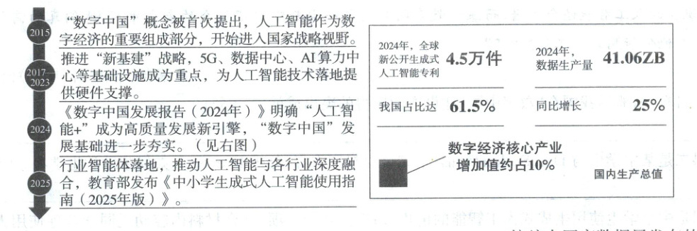 [解析]概括材料内容 由“‘数字中国’概念被首次提出,人工智能作为数字经济的重要组成部分,开始进入国家战略视野”“推进‘新基建’战略,5G、数据中心、AI算力中心等基础设施成为重点,为人工智能技术落地提供硬件支撑”“‘人工智能+’成为高质量发展新引擎,‘数字中国’发展基础进一步夯实”“行业智能体落地,推动人工智能与各行业深度融合”可概括出“我国发展‘数字中国’基础建设,促进人工智能与各行业深度融合”。由“2024年,数据生产量41.06ZB”“同比增长25%”等可概括出“‘数字中国’高质量发展,数据生产量大,增速快”。由“2024年,全球新公开生成式人工智能专利4.5万件”“我国占比达61.5%”可概括出“我国生成式人工智能专利在全球占比大”。由“数字经济核心产业增加值约占10%”“国内生产总值”可概括出“数字经济核心产业增长量大,约占国内生产总值10%,发展速度快”。