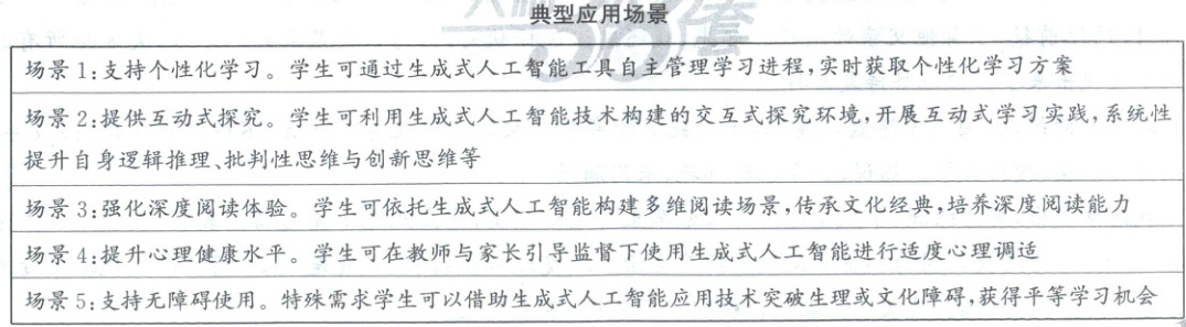 生成式人工智能是指具有文本、图片、音频、视频等内容生成能力的模型及相关技术。围绕不同教育阶段、不同类型的学生学习成长的多样化需求,面向特定场景应用生成式人工智能,提供个性化的支持和指导,促进学生的全面发展和健康成长。