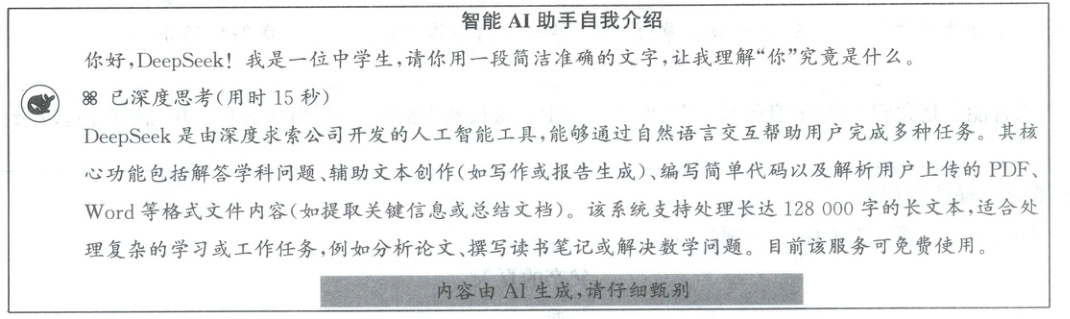 DeepSeek作为人工智能工具,能够通过自然语言生成文本,在交互式场景中帮助学生完成多种任务,在互动中满足学生的个性化需求。例如在材料二中DeepSeek能够回应学生的提问,满足学生的需求,帮助学生了解该人工智能的功能,促进学生的全面发展。