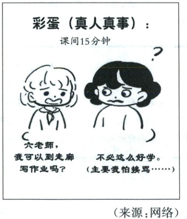 【解析】图文转换,语言表达连贯、简明、得体 结合图片可知,小朋友想到走廊写作业,老师担心被骂就说“不必这么好学”。由此可见,15分钟的课间休息可能存在假象,学生并没有真正得到放松。据此任选一人,言之有理即可。如选老师,结合材料中老师以怕被骂为由不允许学生到走廊写作业的漫画内容,以及课间15分钟政策的目的(放松身心、促进社交等),从理解老师的角度进行表达,强调课间活动的重要性。