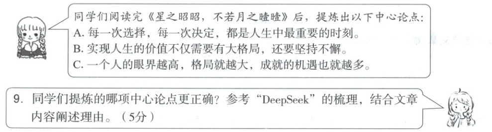 9.B项。文章围绕“格局”和“坚持”展开论述:第②③④段主要论述“格局”对人生选择的影响,并通过引用论证和举例论证,强调格局对选择、成就以及目标的重要性。第⑤⑥段则强调“坚持”的重要性,通过《菜根谭》和庄子的例子,说明成大事者需耐得住寂寞、久久为功。因此,B项准确概括了文章中心论点,与DeepSeek的梳理一致。(选择“B项”1分,结合文章论证思路,说明“格局的重要性”2分,说明“坚持的重要性”2分。若选A、C项不得分)