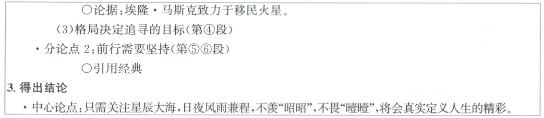 [解析]概括分论点 由第③段“一个人的格局越大,成就的机遇也就越多”以及“马斯克的格局不仅体现在他对未来科技的深刻洞察,还体现在他愿意投资和承担高风险项目,以推动人类文明的进步……这与一些总是盯着底层消费者口袋而‘星之昭昭’的企业家的格局是不能比的”可知,格局大小会对一个人的成就产生决定性影响,所以应是“格局决定成就”。(或“格局决定结局”)