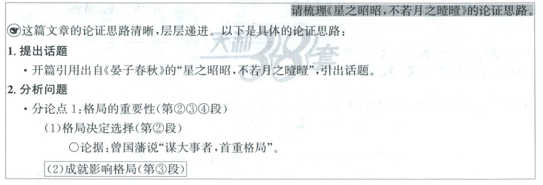 [解析]分析文章中心论点 由【“DeepSeek”解决过程(节选)】中“分论点1:格局的重要性(第②③④段)”“分论点2:前行需要坚持(第⑤⑥段)”可知,全文前一部分聚焦“格局”,后一部分聚焦“坚持”,二者共同构成实现人生价值的必要条件。B项,“实现人生的价值不仅需要有大格局,还要坚持不懈”完整涵盖这两个论点。据此分析概括作答即可。