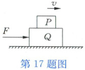 17 如图所示,在水平面上叠放着木块 $ P $ 和 $ Q $,水平推力 $ F $ 推动两个木块一起做匀速运动。以下说法中正确的是(