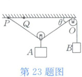 23 如图所示,$ A $、$ B $ 两物体的质量分别是 $ m_A $ 和 $ m_B $,而且 $ m_A > m_B $。整个系统处于静止状态。滑轮的质量和一切摩擦不计。如果把绳一端的固定点 $ P $ 缓缓向右移动到 $ Q $ 点。整个系统重新平衡后,关于物体 $ A $ 的高度和两滑轮间绳与水平方向的夹角 $ \theta $ 的变化,以下说法中正确的是(