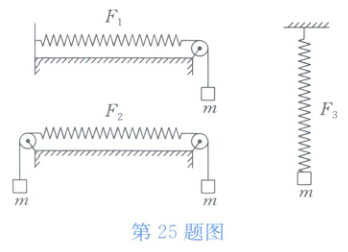 25 在如图所示的实验中,细绳和弹簧的质量不计,不计各处摩擦,每个砝码的质量均为 $ m $,三个完全相同的测力计的示数分别为 $ F_1 $、$ F_2 $ 和 $ F_3 $。它们大小的关系是(