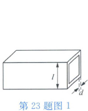 23 有一根横截面为正方形的薄壁管(如图 1 所示),用游标为 20 分度的游标卡尺测量其外部的边长 $ l $ 的情况如图 2 所示;用螺旋测微器测得其壁厚 $ d $ 的情况如图 3 所示。则此管外部边长的测量值为 $ l = $