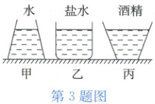 3 如图所示,甲、乙、丙三个不同形状的容器中装有三种不同的液体,液面高度相同,则容器底受到的压强(