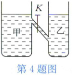 4 如图所示,两容器间用一细管连接,细管上装有一个阀门 $ K $,现两容器中装有液面相平的水,当打开阀门后,水将(