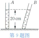 9 如图所示,$ A $、$ B $ 两试管中都装有水,管中水对管底的压强分别为 $ p_{A} = $