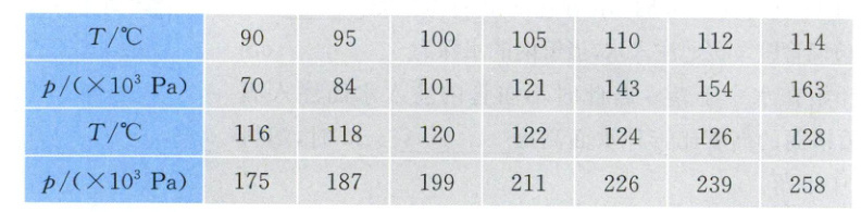 17 学校医务室用高压锅煮水消毒。已知所用的 $ 24 \, cm $ 高压锅的限压阀质量是 $ 0.08 \, kg $,排气孔的内径是 $ 3 \, mm $。根据下面水的沸点与压强关系的表格,求这个高压锅内的最高温度大约是多少。(当时的大气压为 $ 1.03 × 10^5 \, Pa $)