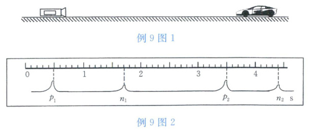 图 1 所示是在高速公路上用超声波测速仪测量车速的示意图。测速仪发出并接收超声波脉冲信号,根据发出和接收到的信号间的时间差,测出被测物体的速度。图 2 中$p_1$、$p_2$是测速仪发出的超声波信号,$n_1$、$n_2$是$p_1$、$p_2$由汽车反射回来的信号。设测速仪匀速扫描,$p_1$、$p_2$之间的时间间隔$\Delta t = 1.0$s,超声波在空气中传播的速度是$v = 340$m/s,若汽车是匀速行驶的,则根据图 2 可知,汽车在接收到$p_1$、$p_2$两个信号之间的时间内前进的距离是________,汽车的速度是________m/s。