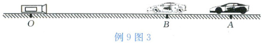(2) 如图 3 所示,汽车第一次在$A$接收信号,第二次在$B$接收信号,信号传送到$B$比传送到$A$少用$0.05$s,因此汽车两次接收到信号的时间差$\Delta t = 1.0$s - $0.05$s = $0.95$s。汽车速度$v = \frac{s}{\Delta t} = \frac{17}{0.95}$m/s ≈ $17.9$m/s。