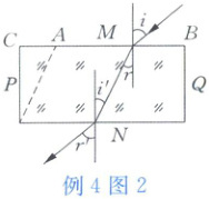 同一个初始条件可能有若干个不同结果。这是对考生思维能力的考查。本题中,当光线射到 $ M $ 上,发生折射。以 $ A $ 为分界点,入射点在 $ A $、$ C $ 之间,光线先要到达 $ P $ 界面,所以一定也要讨论光线在 $ P $ 界面上的情况。光线在 $ P $ 界面一定会发生反射现象,是否发生折射要看入射角是否大于临界角,由于此问题与本题无关所以可以不加讨论。如果试题提出光线在 $ P $ 界面的情况时,就要认真讨论,此时的结论是:入射到 $ M $ 面光线的入射角满足 $ i \leqslant \arcsin \sqrt{n^{2} - 1} $ 条件时,光线不会从 $ P $ 界面射出。