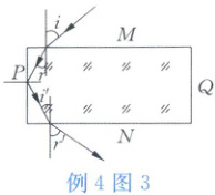 若光通过 $ M $ 面先射到 $ P $ 面再射到 $ N $ 面(见图 3),由几何关系可以证明入射角 $ i' = r $,根据折射定律,折射角 $ r' = i $,同样不可能发生全反射。故应选 B、D。
