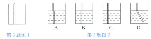 3 相对观察者,将一根细直棒竖直放在玻璃烧杯中的中心线偏左处,如图 1 所示,现在往杯中注人大半杯水,人眼从侧面看时,所看到的现象可能是图 2 中的哪一个?(