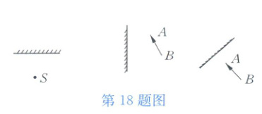 18 根据平面镜成像的特点,在图中画出点光源 $ S $ 或物体 $ AB $ 通过平面镜所成的像。