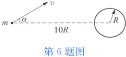 6 某行星质量为 $ M $,半径为 $ R $。如图所示,在距该行星中心 $ 10R $ 处有一物体正沿着它与行星中心连线夹角为 $ \alpha = 30^{\circ} $ 的方向向行星靠拢,问此物体的速度至少要多大才能避免与行星发生碰撞?