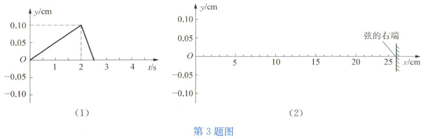 3 将一根长约$100\mathrm{cm}$的均匀弦线沿水平的$x$轴放置,拉紧并使其两端固定。现对离固定的右端$25\mathrm{cm}$处(取该处为原点$O$)的弦上施加一个沿垂直于弦线方向(即$y$轴方向)的扰动,其位移随时间的变化规律如图(1)所示。该扰动将沿弦线传播而形成波(孤立的脉冲波),已知波在弦线中的传播速度为$2.5\mathrm{cm}/\mathrm{s}$,波在传播和反射过程中都没有能量损失。