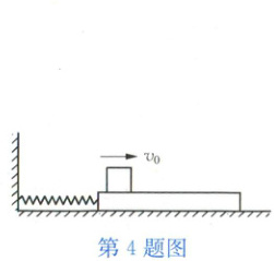4 如图所示,质量为$M$、足够长的长方形木板静止于光滑的水平地面上,左端与劲度系数为$k$的水平轻弹簧相连,弹簧的另一端固定在墙上。木板上面有一个质量为$m$的物块。$t = 0$时,木板静止,物块以一定的初速度开始向右运动。已知物块与木板间的摩擦因数为$\mu$。