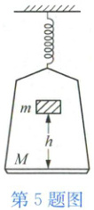 5 一质量为$M$的盘子,悬挂在劲度系数为$k$的轻弹簧下,质量为$m$的砝码在离盘高$h$处自由落下掉在盘中(如图),砝码落入盘中后随即与盘子一起向下运动。问:自砝码与盘相碰至盘运动到最低位置的过程历时多少?