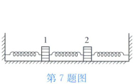 7 两个劲度系数均为$k$、质量均为$m$的相同弹簧振子$1$、$2$置于光滑水平台面上,其固定端分别位于台面的两侧,两物块间又以劲度系数为$3k/2$的弹簧相连(如图)。现使两物块在台面上做同频率的简谐运动。试问此振动的频率为多少?