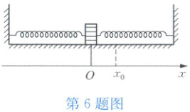 6 如图所示是放置在水平面上的两根完全相同的轻质弹簧与一个质量为$m$的物块组成的振子,每根弹簧的劲度系数均为$k$,弹簧的一端固定在墙上,另一端与物块相连,物块与水平面间的动摩擦因数和静摩擦因数均为$\mu$。当弹簧恰为原长时,物块位于$O$点。现将物块向右拉至$O$点右侧$x_{0}$处(未超过弹性限度),然后由静止释放。设弹簧在被压缩及拉长时一直保持在一条直线上,并规定物块从最右端运动至最左端(或从最左端运动至最右端)为一个振动过程。问: