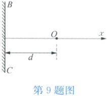 9 如图所示,原点$O$处有一波源,沿$x$轴向两边发射振幅为$A$、圆频率为$\omega$的简谐波,波速为$v$。$x = -d$处有一波密介质的反射面$BC$,入射波在此反射面发生完全反射。若$d = 5\lambda/4$($\lambda$为波长)。求$x$轴上$x \geqslant -d$各处的波动方程。