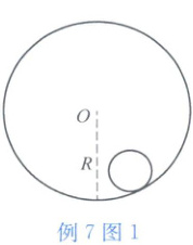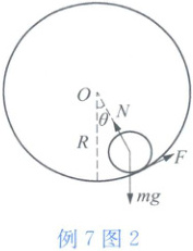 例 7 一个半径为 $ r $、质量为 $ m $ 的均匀实心小圆柱被置于半径为 $ R $、质量为 $ M $ 的薄圆筒中,两者的中心轴水平,截面如图 1 所示。试求下列两种情况下圆柱质心在其平衡位置附近做微振动的频率。