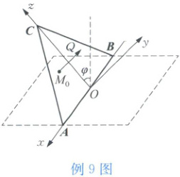 平衡时平板与竖直方向夹角 $ \varphi $,拉力 $ Q $ 作用于 $ M_0(x_0, 0, z_0) $,方向垂直板面($ y $ 轴方向)。
