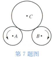 7 $ A $、$ B $ 为两个很长的圆柱形滚筒,半径均为 $ r = 10\ cm $,两筒的轴在同一水平面上且互相平行,它们各自绕自己的轴沿如图所示的方向以角速度 $ \omega = 30\ rad/s $ 转动。两筒的中心轴间相距 $ d = 25\ cm $,两筒上搁着一个较短的圆柱体 $ C $,$ C $ 的半径 $ R = 15\ cm $,质量 $ m = 9\ kg $。今用一个与 $ A $、$ B $ 轴平行的力 $ F $ 拉着 $ C $ 以速度 $ v_{0} = 4\ m/s $ 匀速运动。若 $ C $ 与 $ A $、$ B $ 之间的滑动摩擦因数都是 $ \mu = 1 / \sqrt{3} $,求所需的拉力 $ F $ 大小。