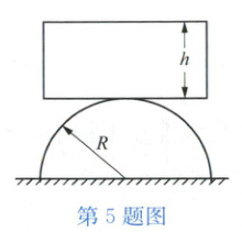 5 如图所示,一个均匀长方体,厚度为 $ h $,静止地放在半圆柱的顶面上,底面呈水平状态。已知半圆柱的半径为 $ R $,长方体与半圆柱间的静摩擦因数足够大。试讨论长方体的平衡属何种平衡。