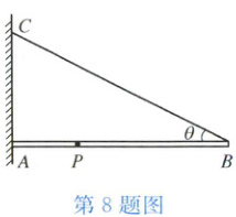8 如图所示,有一长为 $ l $、重为 $ W_{0} $ 的均匀杆 $ AB $,$ A $ 端顶在竖直的粗糙墙上,杆端与墙面之间的静摩擦因数为 $ \mu $,$ B $ 端用一强度足够大且不可伸长的绳悬挂,绳的另一端固定在墙壁上的 $ C $ 点。杆呈水平状态,绳与杆的夹角为 $ \theta $。