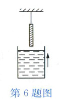 6 用一根细线竖直悬挂一根长为 $ l $ 的均匀细木杆,置于水桶内水平面上方,如图所示。当将水桶缓慢上提时,细木杆逐渐浸入水中。当木杆浸入水中超过一定深度 $ l' $ 时,木杆开始出现倾斜现象,求 $ l' $。已知木杆的密度为 $ \rho $,水的密度为 $ \rho_{0} $。