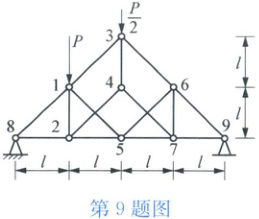 9 如图所示,屋架由同一竖直面内的多根轻杆铰接而成,各铰接点依次为 $ 1 $、$ 2 $、$ ·s $、$ 9 $,其中铰接点 $ 8 $、$ 2 $、$ 5 $、$ 7 $、$ 9 $ 位于同一水平直线上,且点 $ 9 $ 可以无摩擦地水平滑动。各铰接点间沿水平方向上的间距和沿竖直方向上的间距均为 $ l $。铰接点 $ 3 $ 承受有竖直向下的压力 $ P / 2 $,点 $ 1 $ 承受有竖直向下的压力 $ P $。求铰接点 $ 3 $ 和 $ 4 $ 间杆的内力。