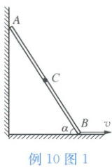 如图 1 所示,直棒 $ AB $ 的 $ A $ 端靠在竖直墙上,$ B $ 端搁在水平地面上,棒长 $ l = 2 m $,棒的两端可分别沿墙面和地面滑动。在棒的中点 $ C $ 处有一质量 $ m = 0.5 kg $ 的小物体被固定在棒上。令棒的 $ B $ 端以速度 $ v = 3 m/s $ 向右匀速滑动,当棒与地面的夹角 $ \alpha = 60^{\circ} $ 时,棒对 $ C $ 处的小物体的作用力有多大?取 $ g = 10 m/s^{2} $。