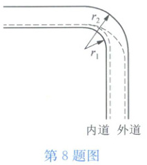 8 如图所示,赛车在水平赛道上做 $ 90^{\circ} $ 转弯,其内、外车道转弯处的半径分别为 $ r_1 $ 和 $ r_2 $,车与路面间的动摩擦因数和静摩擦因数都是 $ \mu $。试问:竞赛中车手应选择图中的内道还是外道转弯?在上述的两条转弯路径中,车手的正确选择较错误选择赢得的时间是多少?