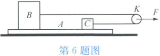 6 如图所示,$ A $ 为放在光滑水平桌面上的长方形物块,在它上面放有物块 $ B $ 和 $ C $。$ A $、$ B $、$ C $ 的质量分别为 $ m_A = m $、$ m_B = 5m $、$ m_C = m $,$ B $、$ C $ 与 $ A $ 之间的静摩擦因数和滑动摩擦因数皆为 $ 0.1 $。$ K $ 为轻滑轮,绕过 $ K $ 连接 $ B $、$ C $ 的轻细绳都处于水平位置。现用沿水平方向的恒定外力 $ F $ 拉滑轮,使 $ A $ 的加速度为 $ 0.2g $($ g $ 为重力加速度)。在这种情况下,$ B $、$ A $ 之间沿水平方向的作用力多大?$ C $、$ A $ 之间沿水平方向的作用力多大?外力 $ F $ 多大?
