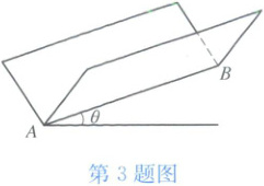 3 质量为 $ m $ 的均匀立方体木块沿倾斜的直角槽 $ AB $ 滑下,$ AB $ 棱的倾角为 $ \theta $,两槽面和过 $ AB $ 棱的竖直平面夹相等的角,如图所示。若立方体木块与直角槽两槽面间的动摩擦因数均为 $ \mu $。试求木块沿槽下滑的加速度。
