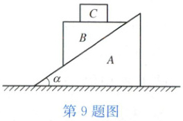 9 如图所示,斜面体 $ A $ 置于水平面上,其斜面的倾角为 $ \alpha $,斜面体 $ B $ 的斜面与 $ A $ 的斜面重合,而 $ B $ 的上表面呈水平状态,物块 $ C $ 置于 $ B $ 的上表面上。已知 $ A $、$ B $、$ C $ 三者质量相等,现将三者同时由静止释放,不计一切摩擦,问:刚释放时物块 $ C $ 的加速度多大?