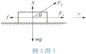 例 3 放在水平面上的质量为 $ m $ 的物体,与水平面间的动摩擦因数为 $ \mu $,物体在水平恒力 $ F_1 $ 的作用下做匀速直线运动。现再对物体施加一大小与 $ F_1 $ 相等的恒力 $ F_2 $。