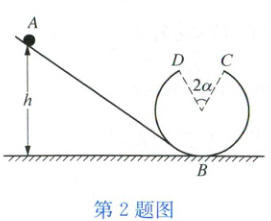 2 如图所示,小球在光滑轨道上自 $ A $ 点由静止开始沿 $ ABCD $ 路径运动,其中半径为 $ R $ 的环形路径上部正中央有一段缺口 $ CD $,该缺口所对的圆心角为 $ 2\alpha $。问:$ \alpha $ 为何值时,小球完成沿 $ ABCD $ 路径运动所需的离水平面的高度 $ h $ 为最小?$ h $ 的最小值为多少?